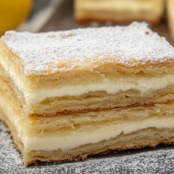 Classic Georgian layered pastry. Delicate layers of flaky pastry filled with smooth vanilla custard, dusted with powdered sugar. A timeless Georgian favorite.
