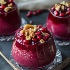 Georgian grape pudding a velvety, naturally sweet pudding made from fresh grape juice and cornmeal, topped with walnuts and pomegranate seeds.