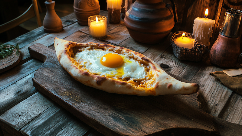 Adjara region traditional open faced khachapuri with our blended cheese, topped with raw egg yolk.