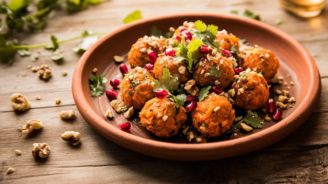 Roasted carrot, walnuts, roasted onions, garlic, coriander, cilantro and pomegranate.