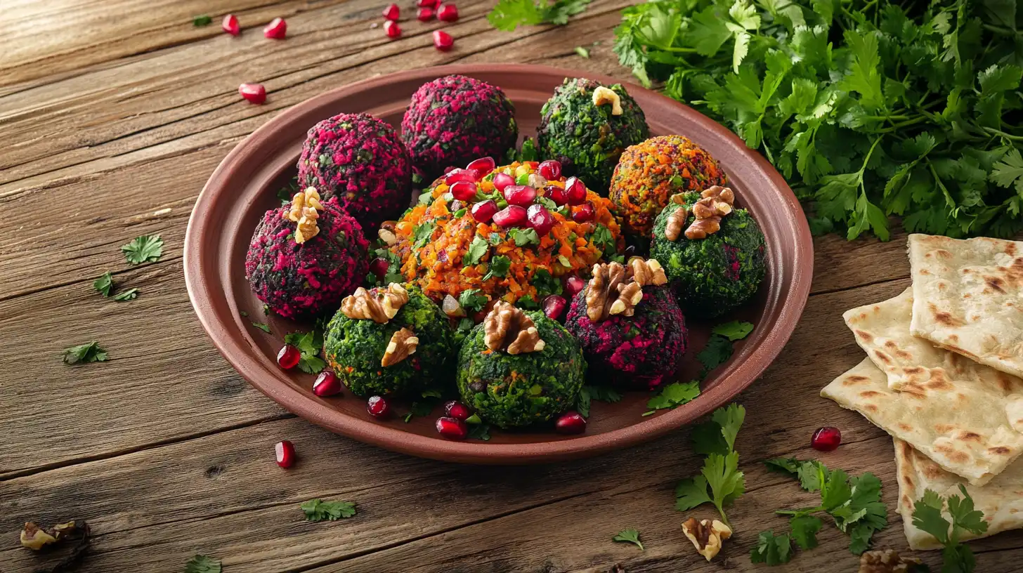 A combination of three types of pkhali – a popular appetizer made from chopped vegetables and herbs with a walnut dressing.