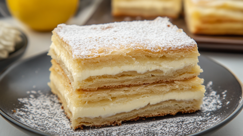 Classic Georgian layered pastry. Delicate layers of flaky pastry filled with smooth vanilla custard, dusted with powdered sugar. A timeless Georgian favorite.